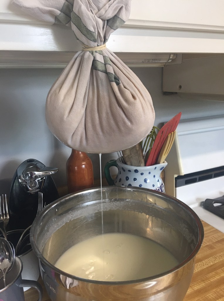 A steady dripping rings out in my kitchen and I listen to the singing of the metal bowl as it catches every drop. Normally I can’t stand repetitive sounds – the ticking of a clock, the smacking of chewing gum, the clicking of a ballpoint pen. But this sound is different. Each drop pops through the surface of the buttermilk that already has collected below. Instead of creating an annoyance, this sound calms my mind and my soul.